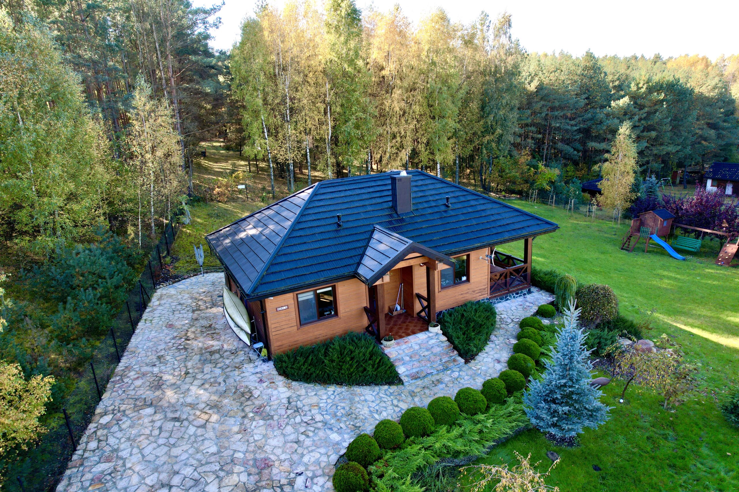 Dom został wykonany z wysokiej jakości drewna i ocieplony wełną mineralną, co gwarantuje doskonałą izolację cieplną. Dach pokryto blachą o nowoczesnym wyglądzie, idealnie współgrającą z drewnianą elewacją.