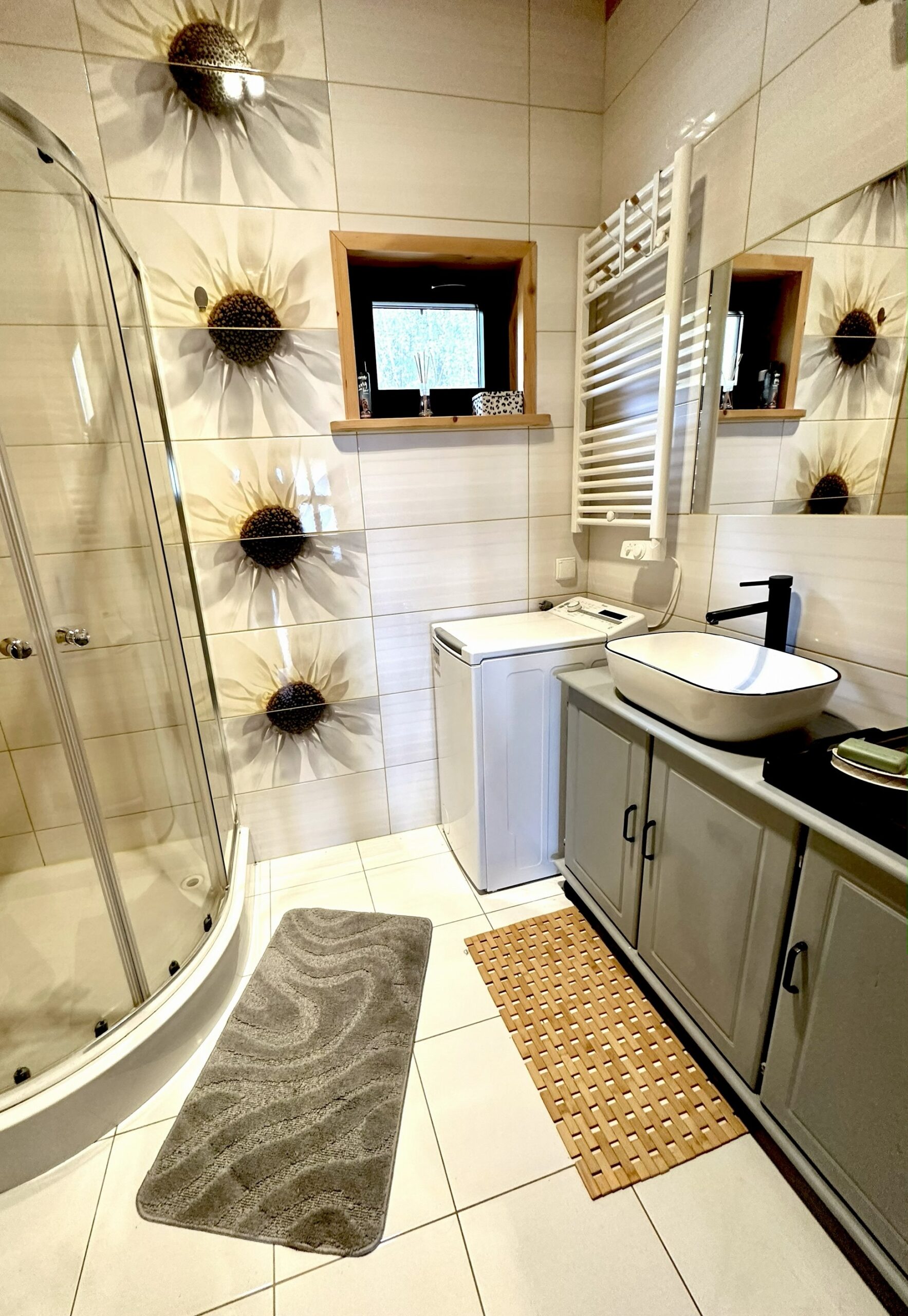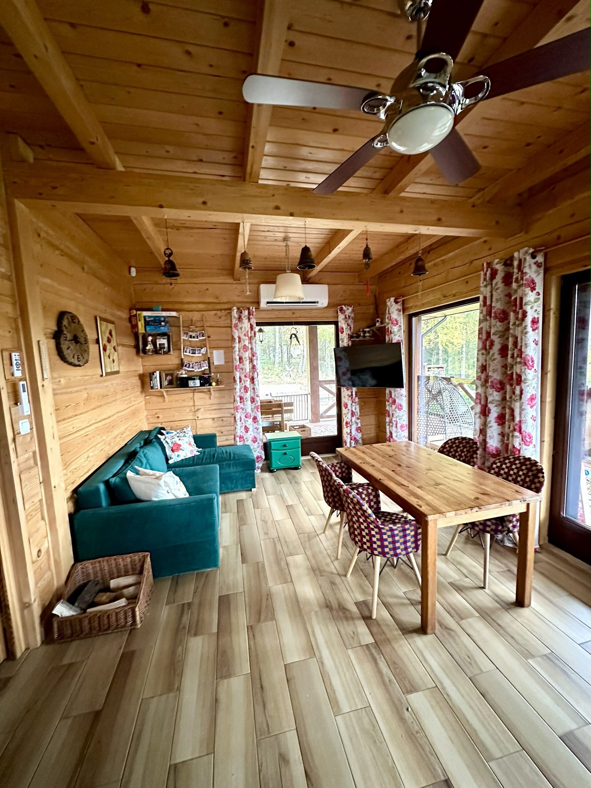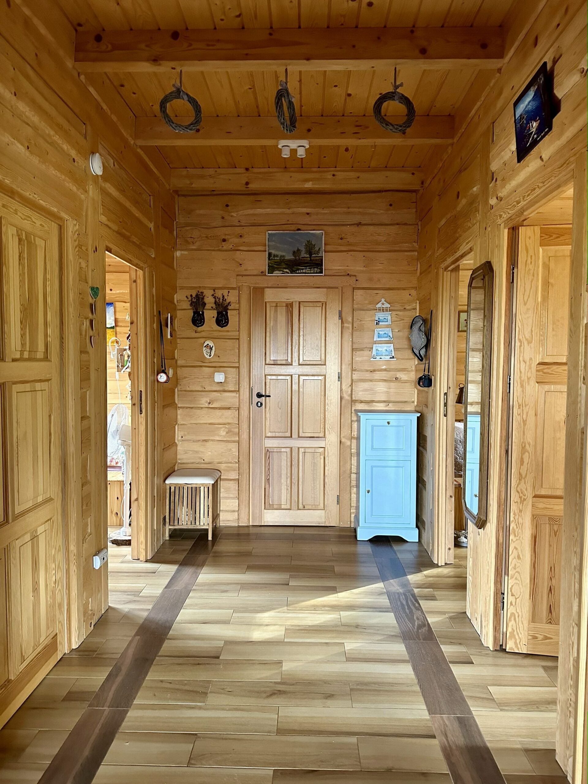 Wszystko utrzymane w spójnej, ciepłej stylistyce, z przewagą naturalnych materiałów, które nadają wnętrzom przyjemny, harmonijny charakter.