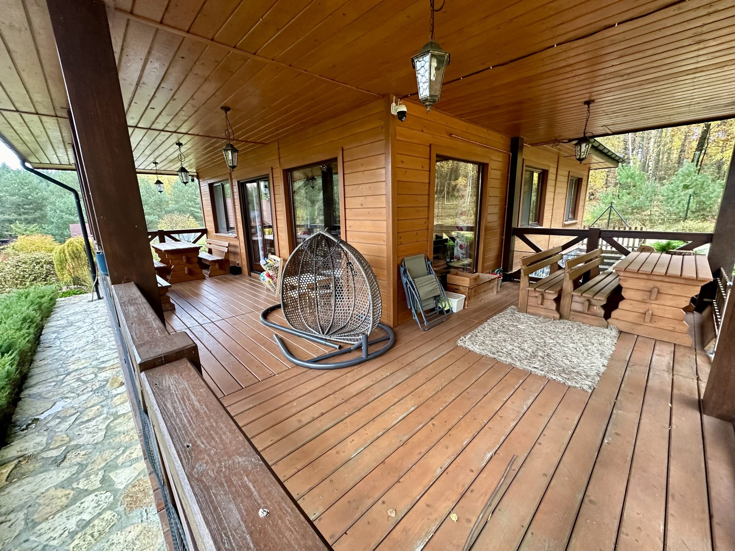Atutem nieruchomości jest również duży, drewniany taras, stanowiący naturalne przedłużenie domu – idealne miejsce na poranną kawę, spotkania z bliskimi lub wieczorny relaks wśród dźwięków natury.