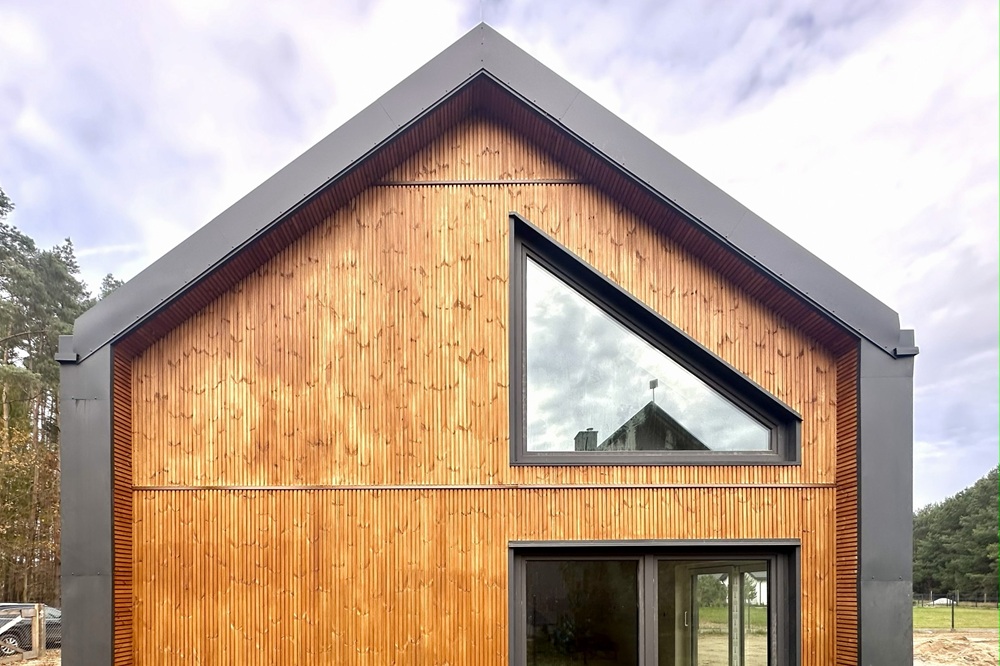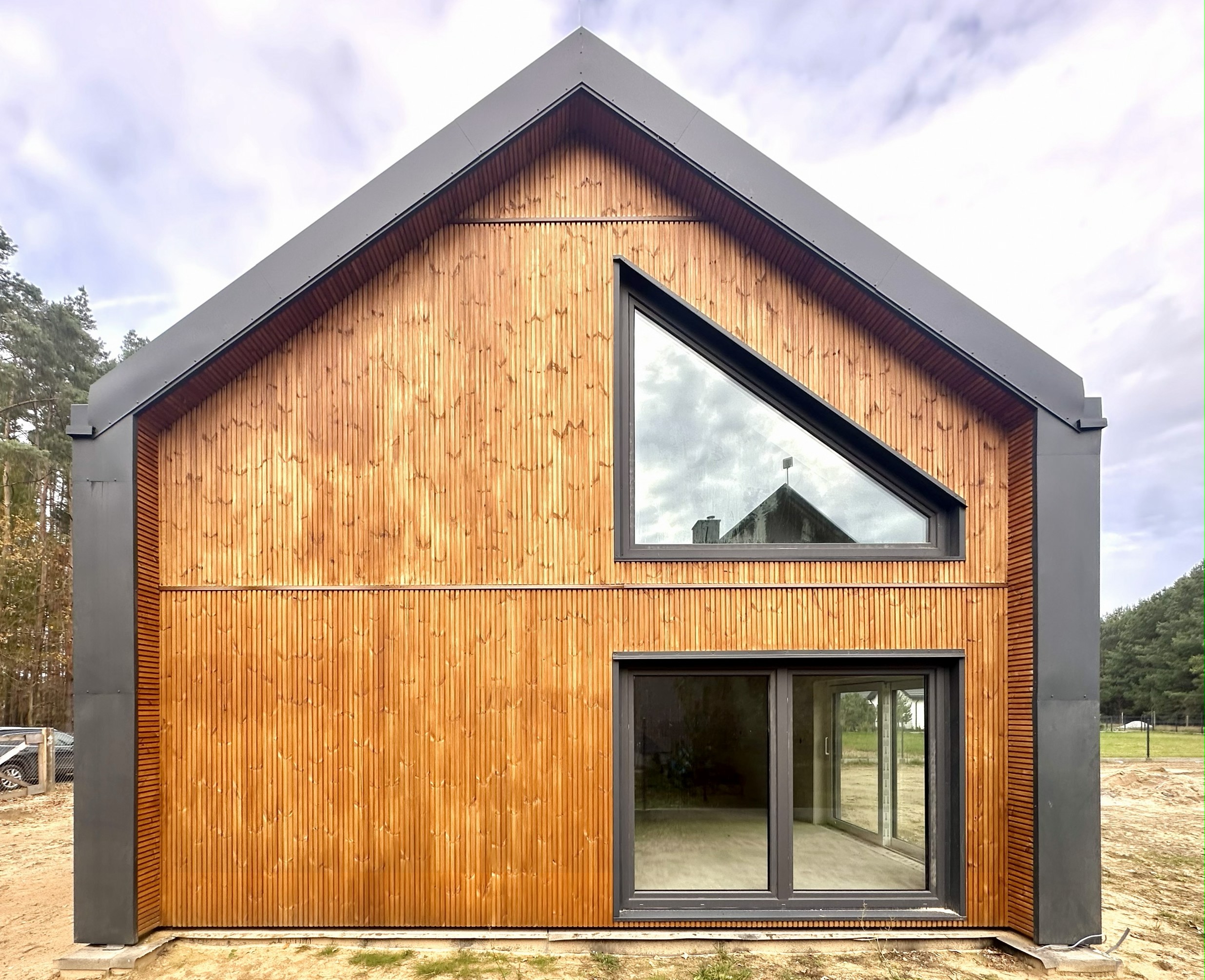 Dom został wykonany w nowoczesnej, prefabrykowanej technologii, łączącej naturalne materiały, wysoką energooszczędność i ponadczasową estetykę.