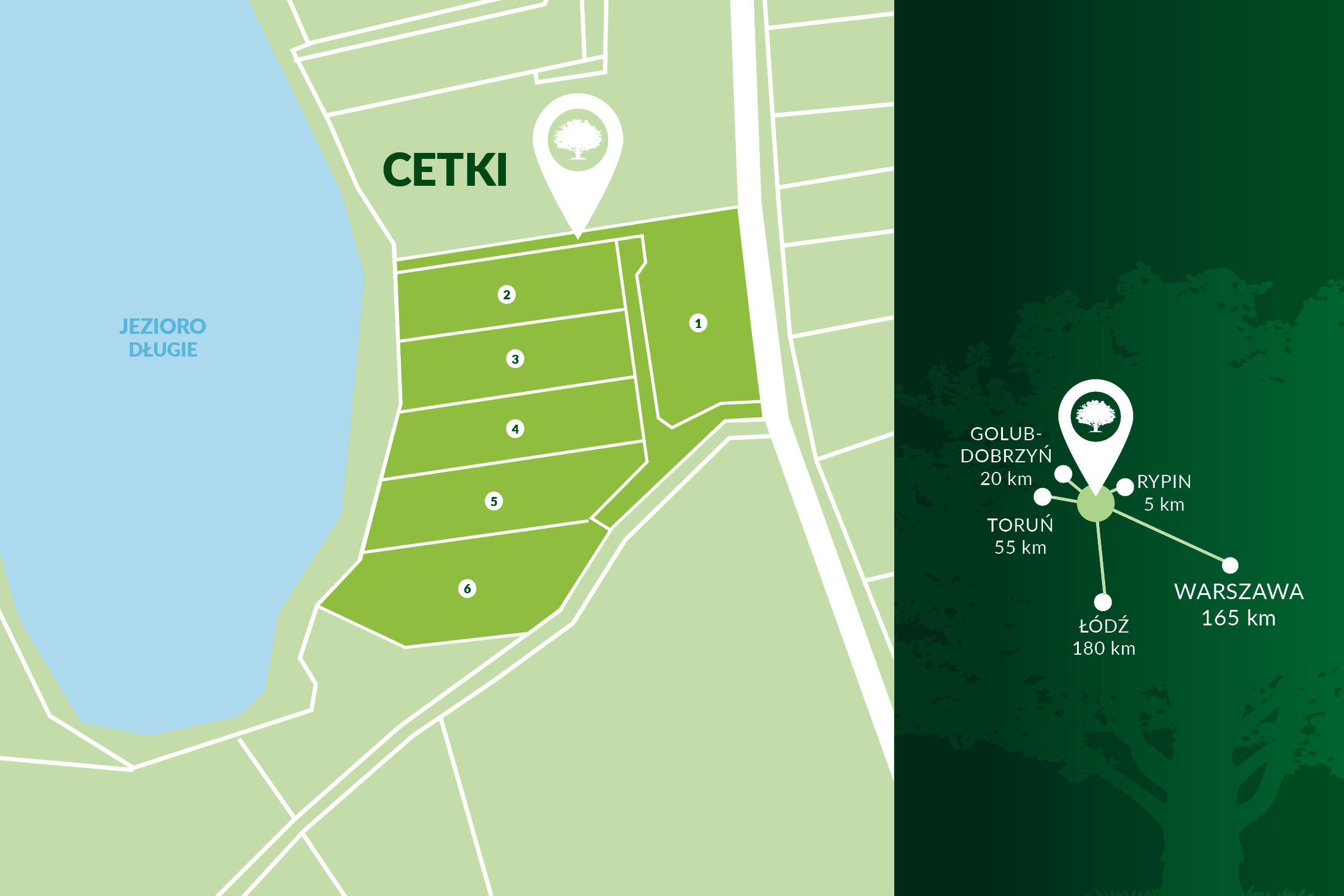 Na sprzedaż oferujemy 6 atrakcyjnych działek położonych nad jeziorem Dłuskim (Cetki, gm. Rypin, woj. kujawsko-pomorskie). Piękna, spokojna okolica, idealna pod budowę domu całorocznego lub letniskowego.