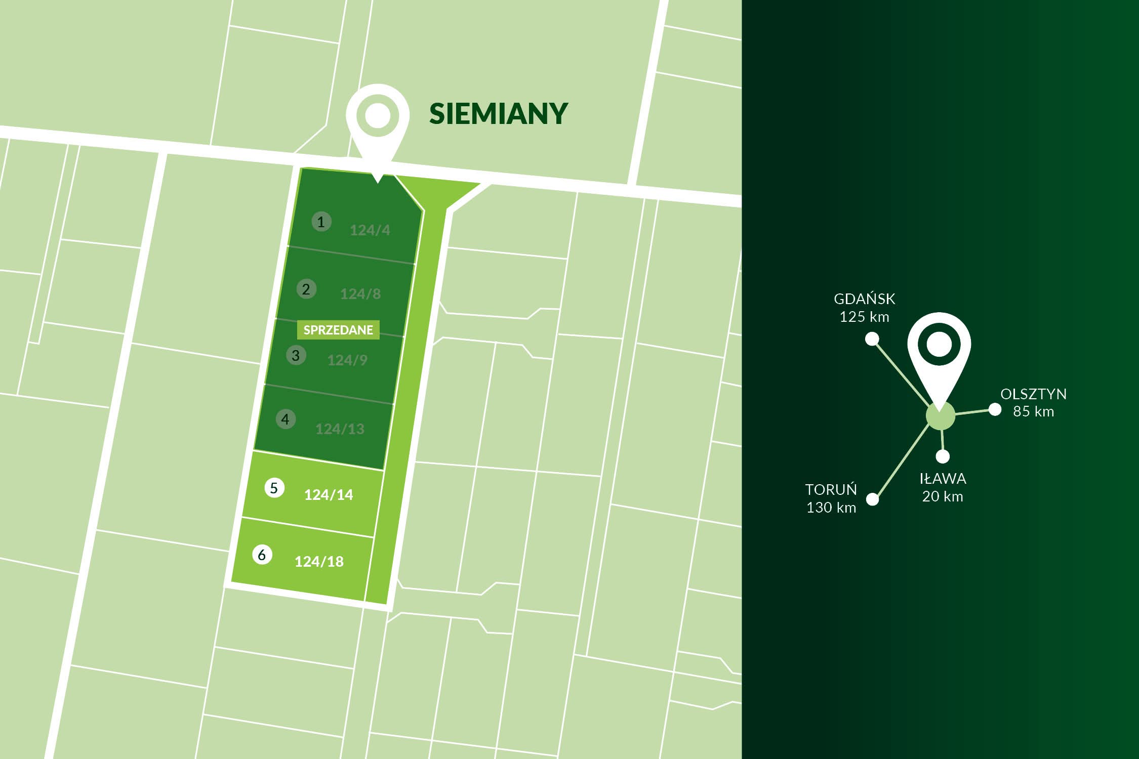 Oferujemy na sprzedaż 2 ostatnie działki budowlane położone zaledwie 500 metrów od jeziora Jeziorak, w miejscowości Siemiany, gmina Iława.